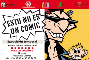 La Casa de Cultura | Biblioteca Pública de Calasparra inaugurará hoy Viernes 14 de octubre ( 17,00 h ) la exposición ESTO NO ES UN COMIC, organizada en colaboración con la Dirección General de Bienes Culturales, Consejería de Cultura y Biblioteca Regional de Murcia. A través de una serie de treinta y seis paneles, se hace un recorrido de un modo muy gráfico, como no podía ser menos, por la evolución del cómic, a través de los acontecimientos que han llevado al nacimiento de la novela gráfica, ese género tan en boga en la actualidad. Esto no es un cómic, esto no es un tebeo como los que yo leía, y algunas variaciones más para expresar lo mismo: SORPRESA. Una sorpresa al descubrir que una historia dibujada puede gustarte tanto como una novela, una película, e incluso hacerte pensar como un ensayo. Vamos a recorrer algunos de los acontecimientos que han llevado al nacimiento de la novela gráfica; a ver si al final de la visita se despiertan las ganas por leer un cómic, novela gráfica, tebeo o como quieran llamarlo. Comienza por su nacimiento, a finales del s. XIX y primeros del XX, unos tiempos de innovación y libertad. Picasso y Dalí fueron grandes aficionados a esa forma artística. Poco después, cómic y cine se desarrollaron en paralelo, pero pronto sería aventajado por el cine, aunque tomó del cómic la figura del superhéroe, desde entonces común en ambos géneros. A principios de los años 50 fue sometido a grandes censuras en EEUU y en España. A aquella época pertenecen Carpanta, el Capitán Trueno, el Jabato, la Rue del Percebe… Años después, con la revolución hippie, el cómic recupera su capacidad de protestar. Se hace adulto, por fin, en Europa, cuando Maus obtiene el Premio Pulitzer. Mientras, Japón prepara la invasión Manga… Fue a partir de la movida, en los 80, cuando el tebeo se hizo cómic a golpe de underground. A partir de entonces, su lectura provoca también emoción, denuncia, sorpresa, aprendizaje, asombro… En muchas bibliotecas se crean comictecas, y se convoca por primera vea el Premio Nacional del Cómic. Literatura, cine, artes plásticas, fotografía… Todo confluye en la llamada “novela gráfica”, tan de moda en la actualidad, un nuevo género ya dentro de la novela. Ahora el cómic es una nueva manifestación artística, que se nutre de todas y aporta una visión nueva sobre la creación. Leer cómics, hoy, ya no es solo cosa de frikis.