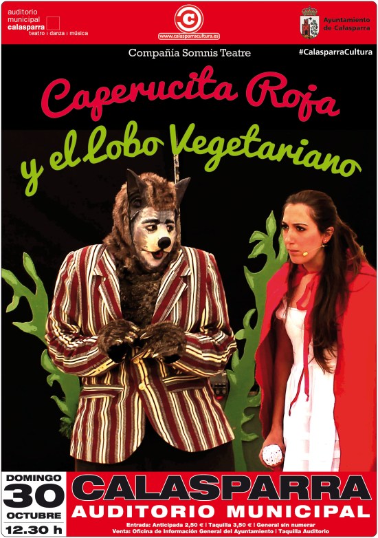 La joven compañía ilicitana Somnis Teatre se adentra en el mundo de la literatura infantil para representar una versión libre de uno de los clásicos más conocidos de los Hermanos Grimm – Caperucita y el Lobo – pero en esta ocasión con un protagonista muy especial. Un lobo miedoso, bueno, tímido, bobalicón… y lo más sorprendente: ¡¡¡¡¡¡UN LOBO VEGETARIANO!!!!!!! Un lobo enamorado de las zanahorias y con debilidad por los pasteles de esa hortaliza naranja, pero que se encuentra con dificultades para hacer amigos por culpa de los prejuicios. Nadie se permite el tiempo de conocerlo. Todos le huyen, nadie le habla… Esta solo… solo y triste… ¿Quién ha dicho que todos los lobos son malos? ¿Será Caperucita tan valiente como para no asustarse del lobo? ¿Llegarán a ser amigos?