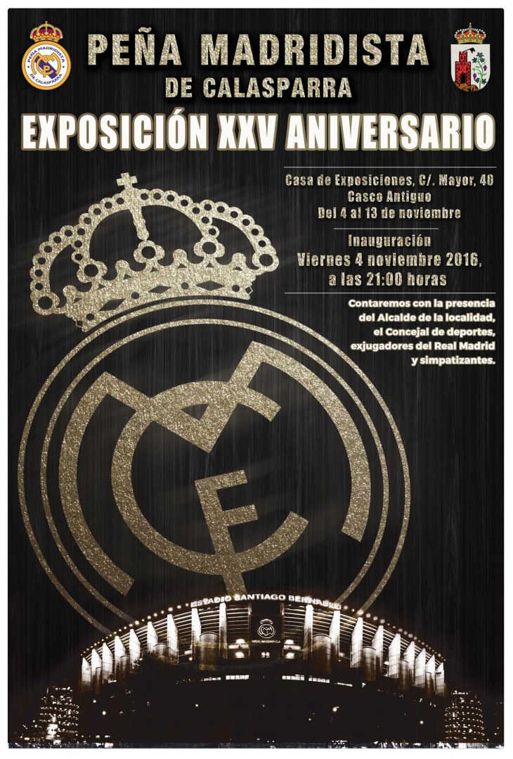 2 noviembre, 20162 noviembre, 2016 by Oí Producción Artística XXV ANIVERSARIO PEÑA MADRIDISTA DE CALASPARRA 04/11 Aniversario, Exposición Deja un comentario Del 04 al 13 de Noviembre | Inauguración: Viernes 04 de noviembre | 21:00 h Casa de Exposiciones | C/ Mayor, 40 (casco antiguo) De lunes a viernes: 18:00/20:30h | Sábados: 12:00/13:30h y 17:30/20:00h | Domingos y Festivos: 12:00/13:30h Relacionado