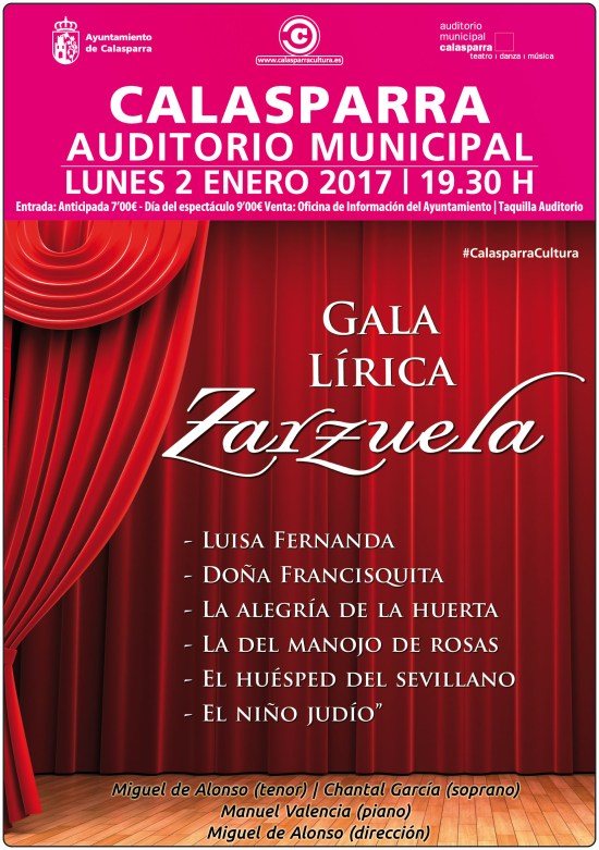 El prestigioso tenor burgalés Miguel de Alonso interpretará clásicos de la zarzuela (“ Luisa Fernanda ”, “ Doña Francisquita ”, “ La alegría de la huerta ”, “ La del manojo de rosas ”, “ El huésped del sevillano ”, “ El niño judío” ) en una gala lírica dentro de la programación cultural de Navidad en el Auditorio Municipal de Calasparra el próximo 2 de enero a la 19,30 h en compañía de la soprano Chantal García y del pianista Manuel Valencia. Su carrera profesional ha estado jalonada por innumerables éxitos. En calidad de primer tenor de la Compañía Lírica Nacional, en la Compañía Lírica Española y la Compañía Lírica de José Tamayo, ha interpretado