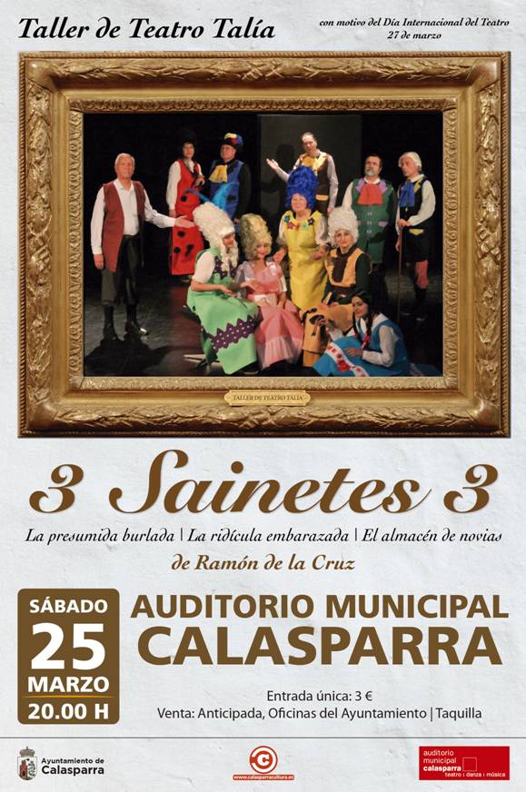 Talía rescata así los sainetes, un género considerado menor y que servía para amenizar, de manera burlesca y cómica, los entreactos de las obras serias en el siglo XVII. Dirigido por José Ángel Moya, “3 sainetes 3” contará con tres de los más de 300 sainetes que escribió el autor y que no eran otra cosa que pequeños apuntes costumbristas de asunto humorístico, llenos de música y canciones, compuestos con agilidad y gracia en verso, en los que retrataba al Madrid de su tiempo. “La ridícula embarazada”, una farsa de corte “molieresco”; “El almacén de las novias”, un cuadro de costumbres de tipos femeninos, y “La presumida burlada”, son los tres sainetes seleccionados por el taller de teatro Talía para la representación de este sábado 25 de marzo (20.00 h) en el Auditorio Municipal.