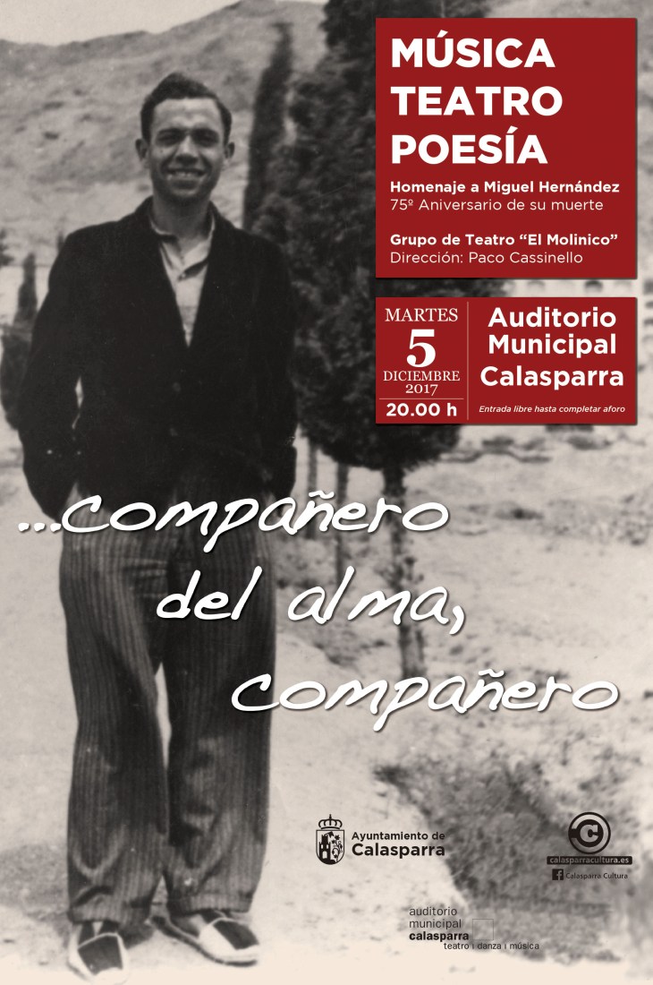4 diciembre, 201711 noviembre, 2018 by Oí Producción Artística HOMENAJE A MIGUEL HERNÁNDEZ | MÚSICA TEATRO POESÍA 5/12 Cultural, Lectura, Literatura, Poesía, Sin categoría Por el Grupo de teatro «El Molinico» Martes 5 de diciembre | 20:00h Auditorio Municipal de Calasparra Entrada libre hasta completar aforo Relacionado