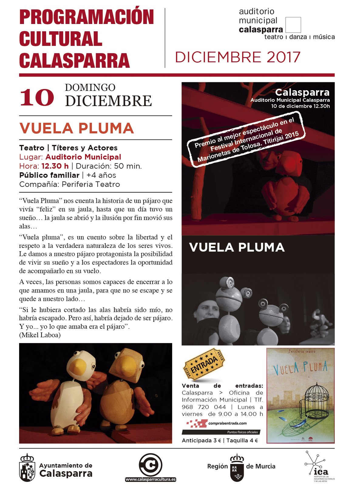 «Vuela Pluma» nos cuenta la historia de un pájaro que vivía “feliz” en su jaula, hasta que un día tuvo un sueño… la jaula se abrió y la ilusión por fin movió sus alas… “Vuela pluma“, es un cuento sobre la libertad y el respeto a la verdadera naturaleza de los seres vivos. Le damos a nuestro pájaro protagonista la posibilidad de vivir su sueño y a los espectadores la oportunidad de acompañarlo en su vuelo. A veces, las personas somos capaces de encerrar a lo que amamos en una jaula, para que no se escape y se quede a nuestro lado…