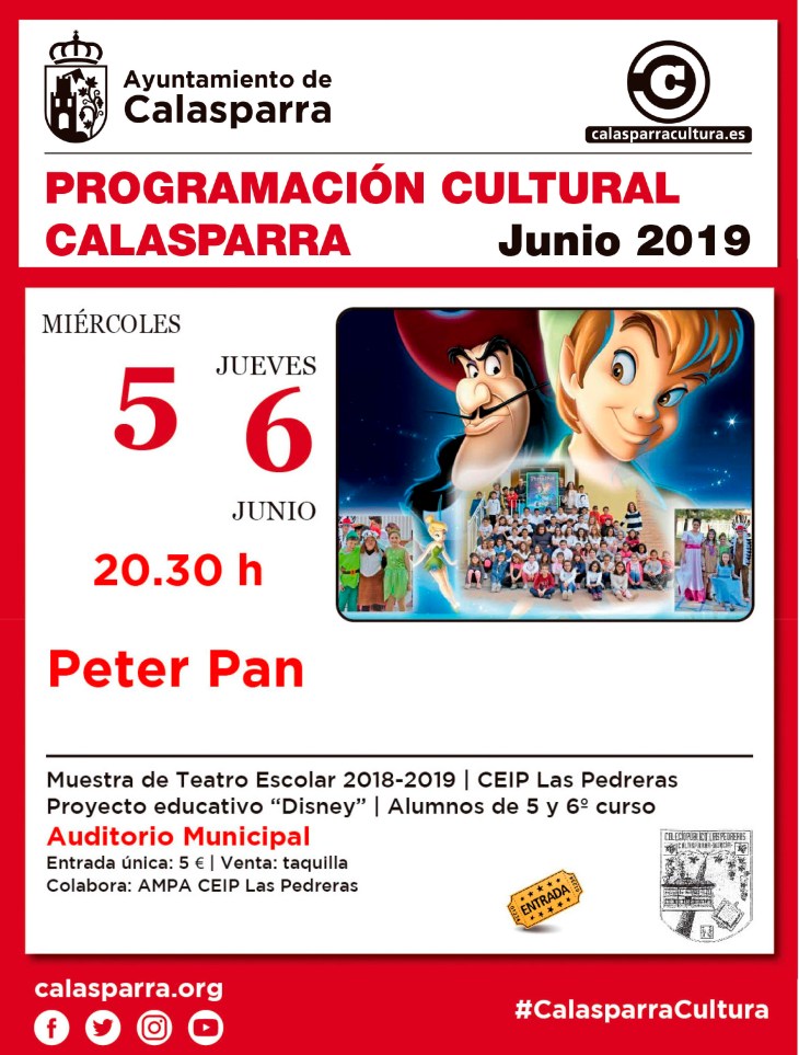 4 junio, 201910 julio, 2019 by Oí Producción Artística PETER PAN | MUESTRA DE TEATRO ESCOLAR | 05&06/06 Sin categoría, Teatro, Teatro escolar MUESTRA DE TEATRO ESCOLAR 2018/2019 | CEIP LAS PEDRERAS PROYECTO EDUCATIVO «DISNEY» | ALUMNOS DE 5 Y 6º CURSO Miércoles 05 y jueves 06 de junio | 20:30 h Calasparra | Auditorio Municipal Entrada única en taquilla: 5 € Colabora AMPA CEIP Las Pedreras Relacionado