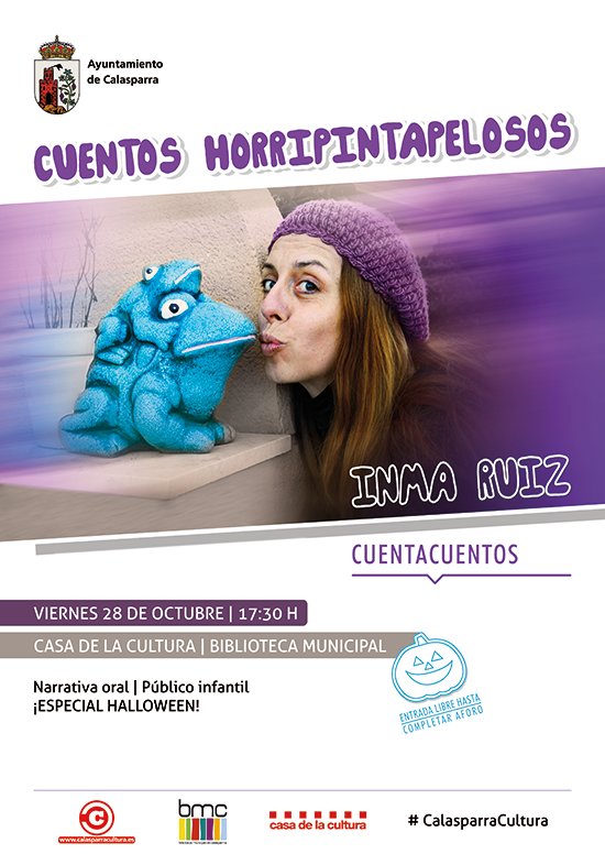 Ciclo Calasparra con Niños, que organiza este otoño la Concejalía de Cultura del Ayuntamiento de Calasparra con la idea de que sea el público infantil y familiar el protagonista de estas citas con la tradición oral y algunos de los clásicos de la literatura infantil teatralizados durante los fines de semana en diferentes escenarios. La narradora Inma Ruiz, dedicada profesionalmente a contar desde hace años, tiene en su haber varios espectáculos relacionados con la narración oral y la animación, tanto para niños como para adultos. Pertenece a la Red Internacional de Cuentacuentos, forma parte de la AEDA (Asociación de profesionales narradores orales de España), además de tocar otros palos profesionales relacionados con la comunicación y la interpretación. En su nueva visita a la Biblioteca Municipal nos acercará al mundo de la fantasía y la imaginación con «Cuentos Horripintapelosos»: historias horripilantes y un peinado «monstruoso», un combinado perfecto para «morirse de risa».